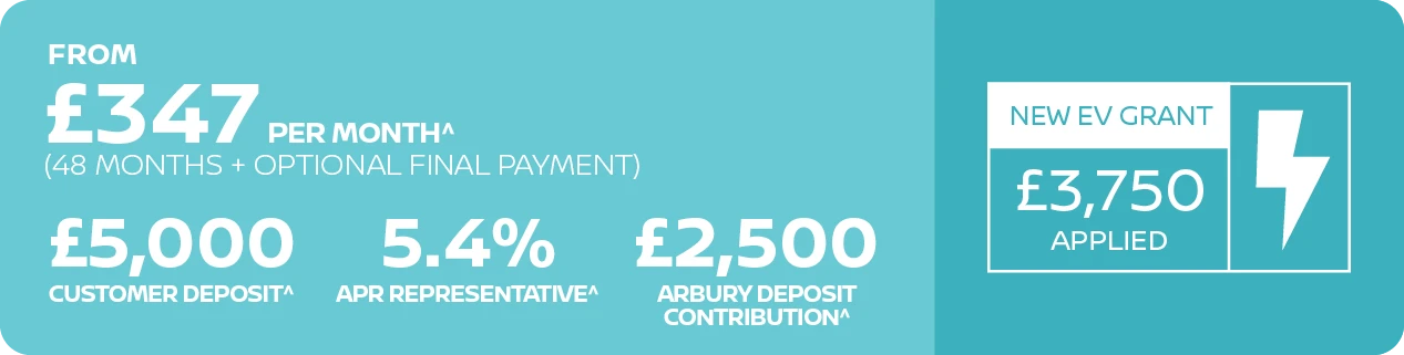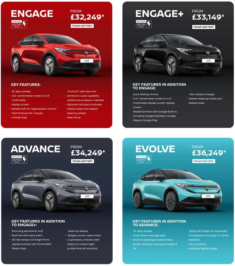 *Electric Car Grant (ECG) of £3,750. ECG scheme subject to UK Government terms and conditions. Prices ranging from price of £32,249 is based on a Nissan LEAF 75kWh Engage excl. cost of optional paint & personalisation