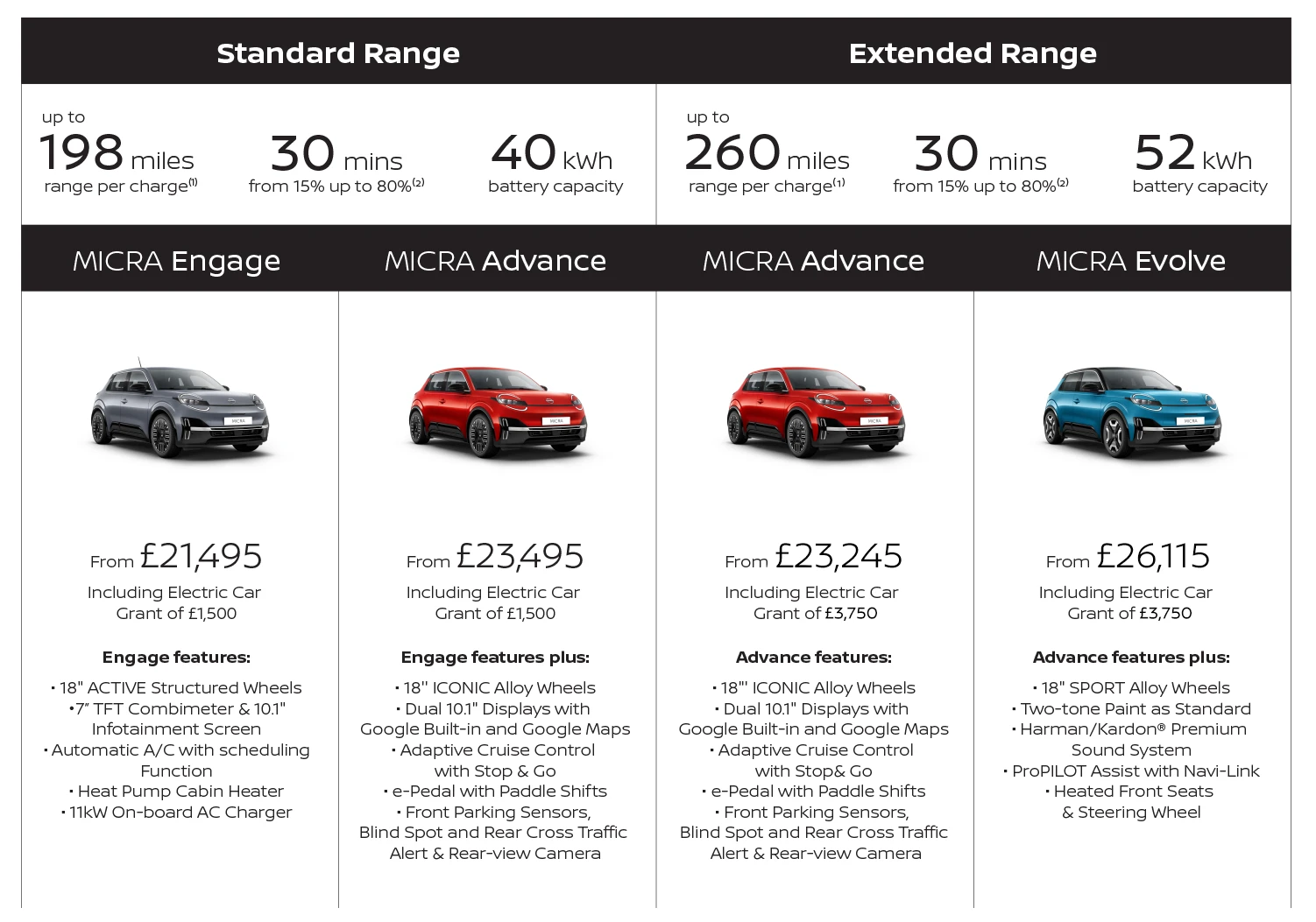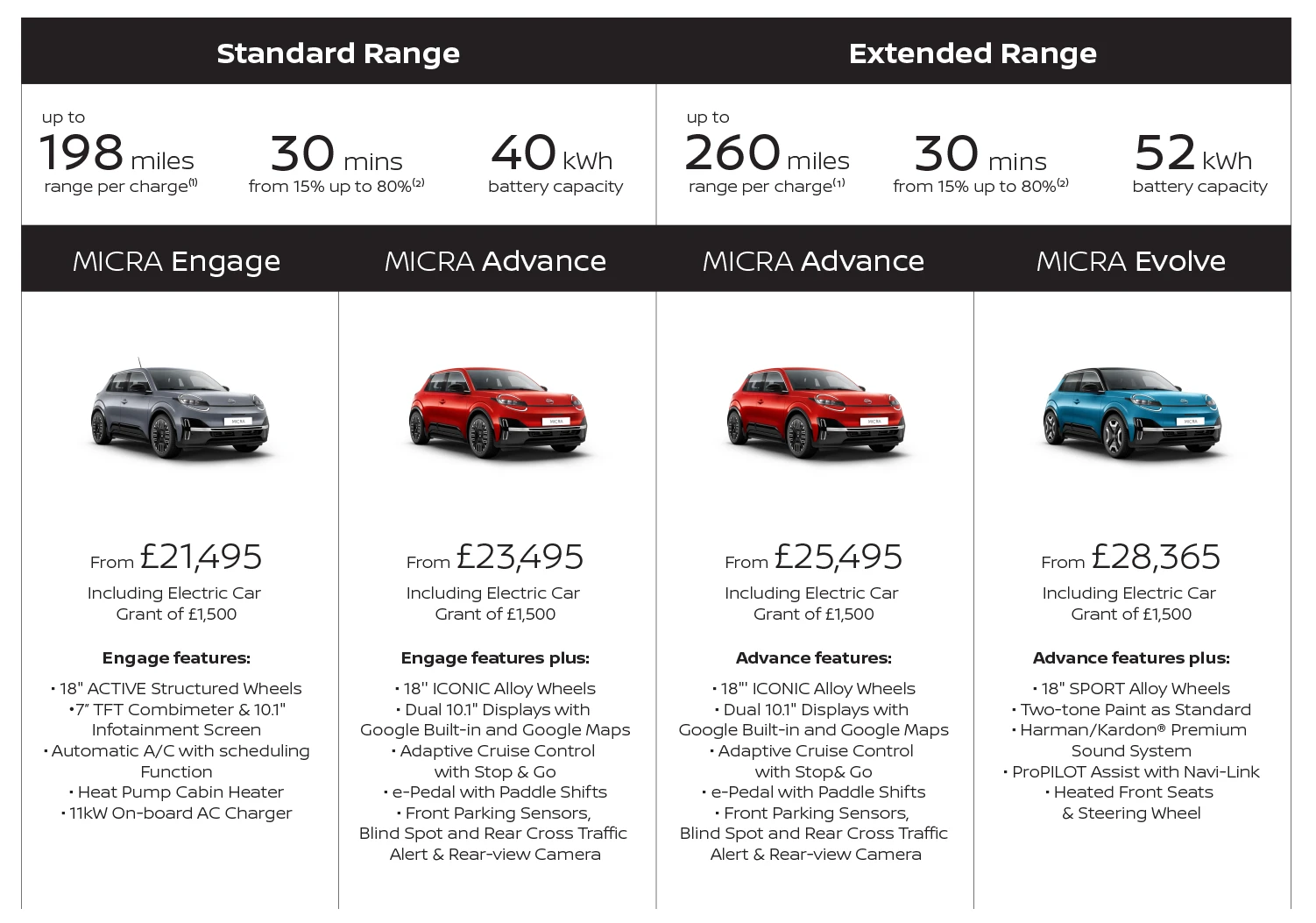 (1) Up to 198 miles range refers to the MICRA 40kWh and up to 260 miles range refers to the MICRA 52kWh (range figures pending final homologation) based on a full charge. WLTP figures shown are for comparability purposes. Only compare electric range figures with other cars tested to the same technical procedures. Actual real world driving results may vary depending on factors including the starting charge of the battery, accessories fitted after registration, weather conditions, driving styles and vehicle load.