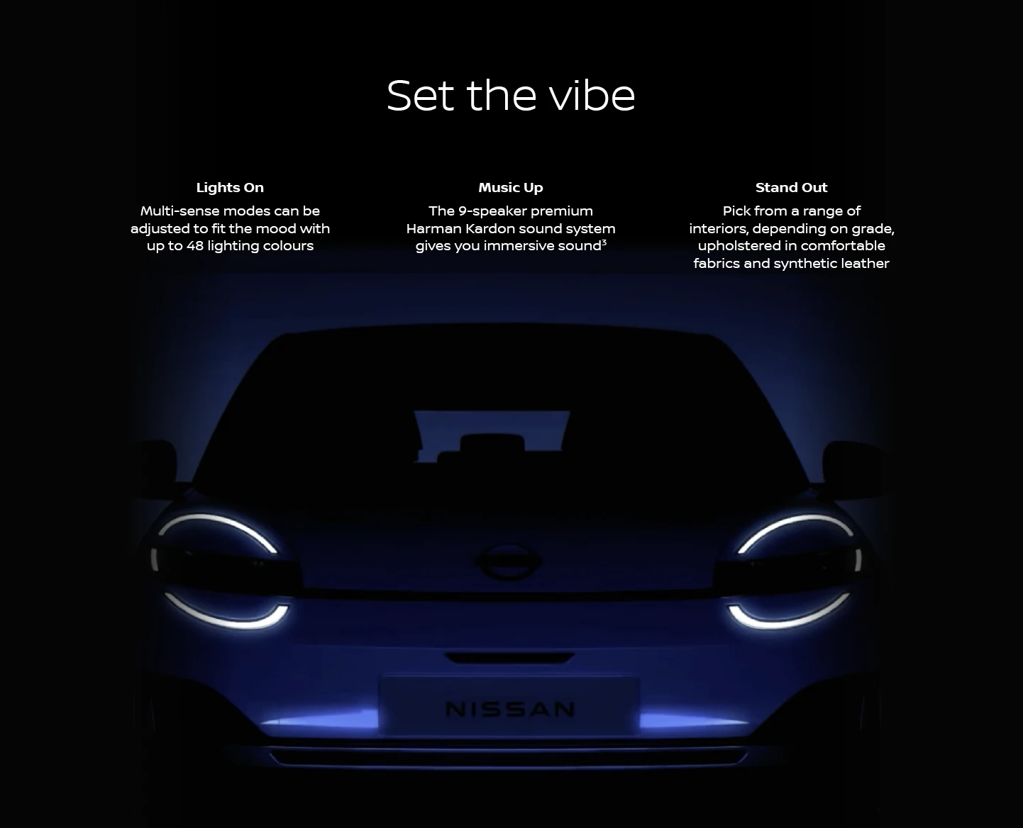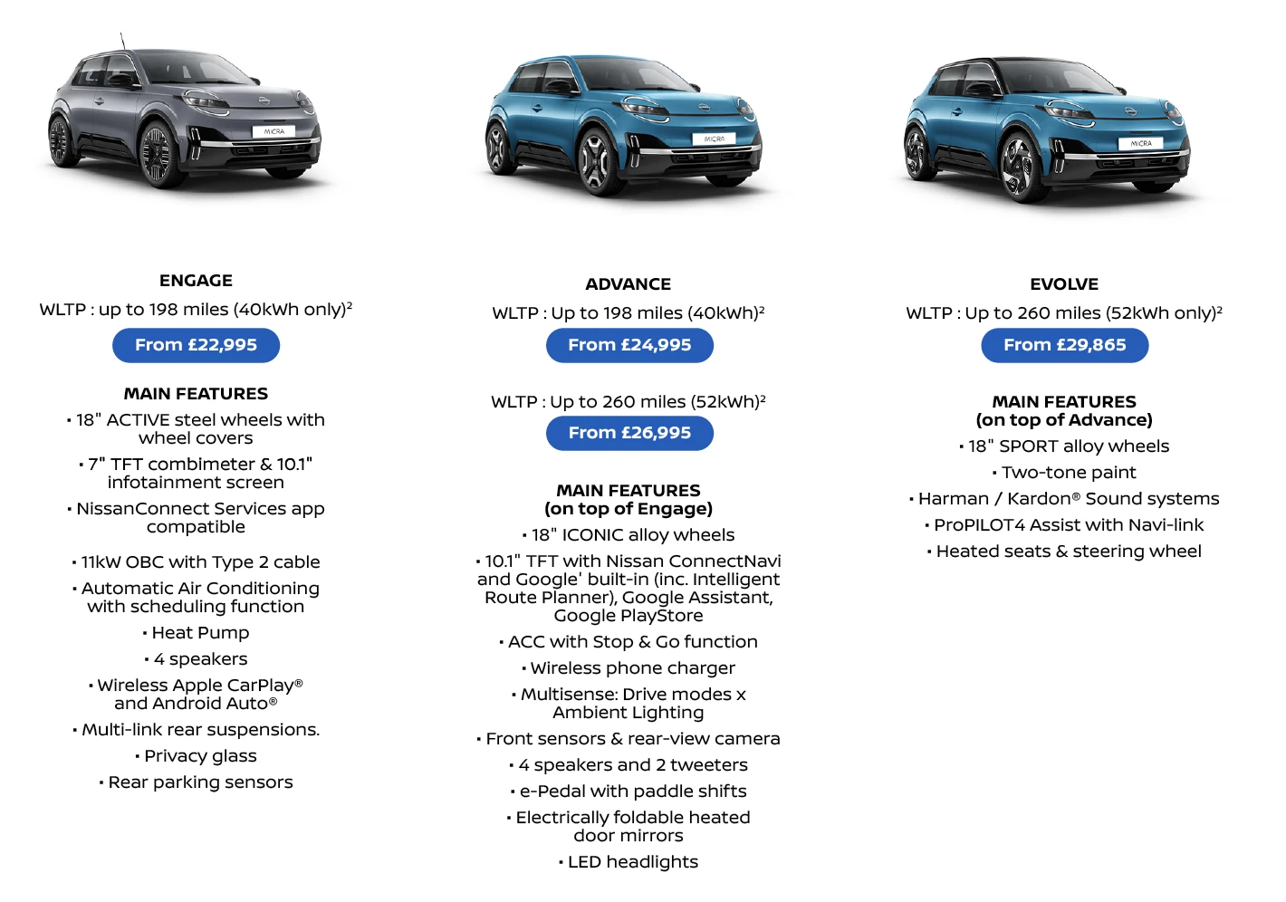2 Up to 198 miles range refers to The All-New Nissan MICRA 40kWh and up to 260 miles range refers to The All-New Nissan MICRA 52kWh (range figures pending homologation). WLTP figures shown are for comparability purposes. Actual real world driving results may vary depending on factors including the starting charge of the battery, accessories fitted after registration, weather conditions, driving styles and vehicle load.
